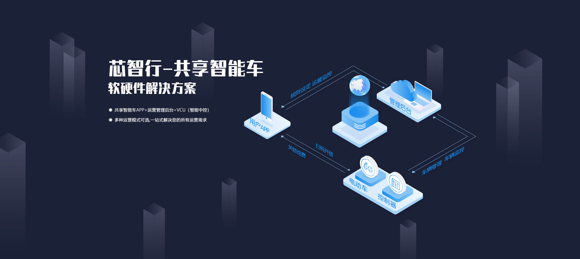 共享智能車APP + 運(yùn)營管理后臺(tái) + VCU(智能中控)= 一站式解決方案